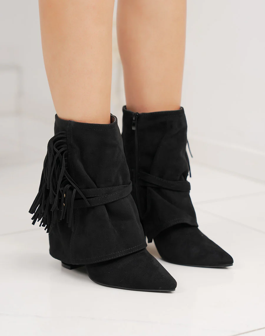 Ajoutez une touche bohème et sophistiquée à votre dressing avec cette bottine femme noire en suédine. Son design original se distingue par un revers à franges dynamiques, une boucle dorée élégante et un bout pointu qui allonge visuellement la jambe. Son talon de 9cm assure une allure élancée tout en restant confortable au quotidien.