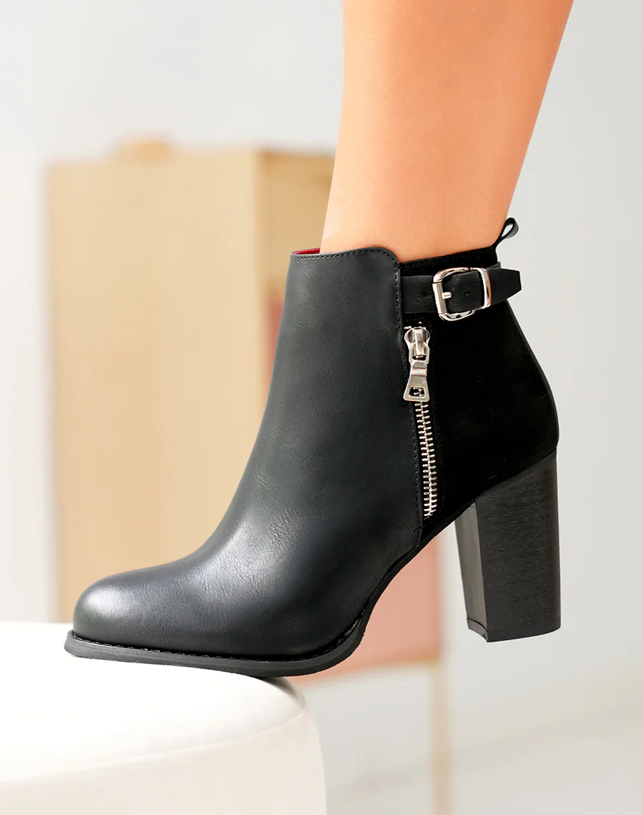 Bottines à talons noires bi matières avec sangle