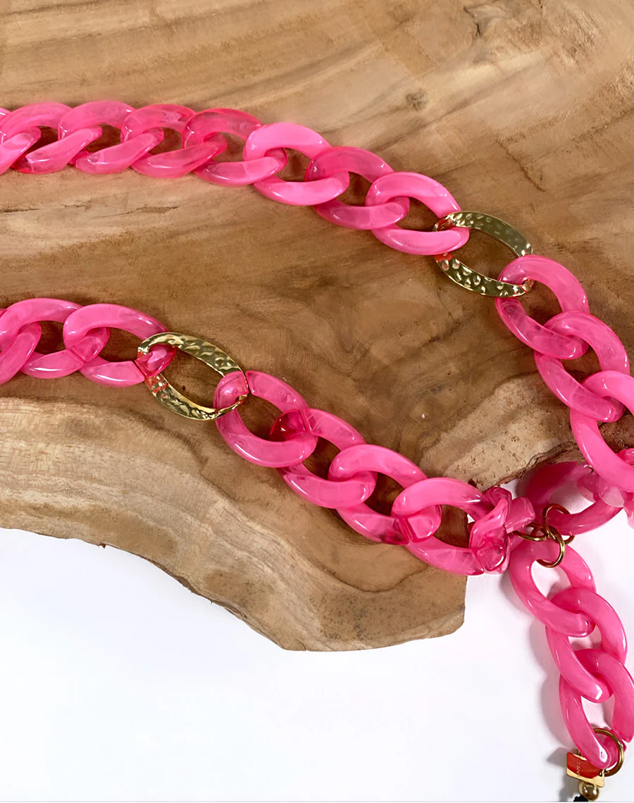 Donnez du peps à vos tenues avec ce collier de téléphone rose ! Sur une tenue bohème chic toute beige portez Mahdia et plus besoin d’autres accessoires pour ajouter de la couleur !