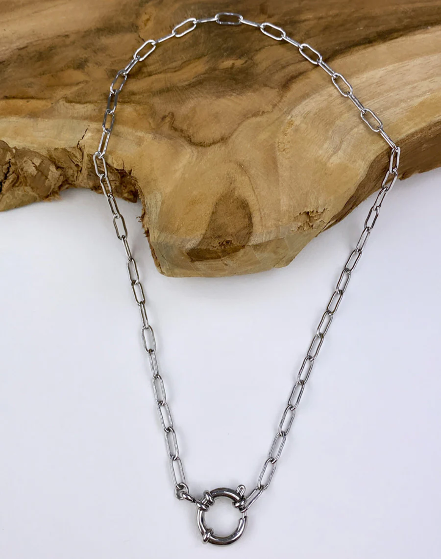 Simple indémodable et tendance. Il a une chaine fine argentée accompagnée d’un fermoir rond assez imposant qui se met à l’avant. Il peut également faire place à de la personnalisation vous pouvez ajouter des pendentifs si vous le souhaitez.