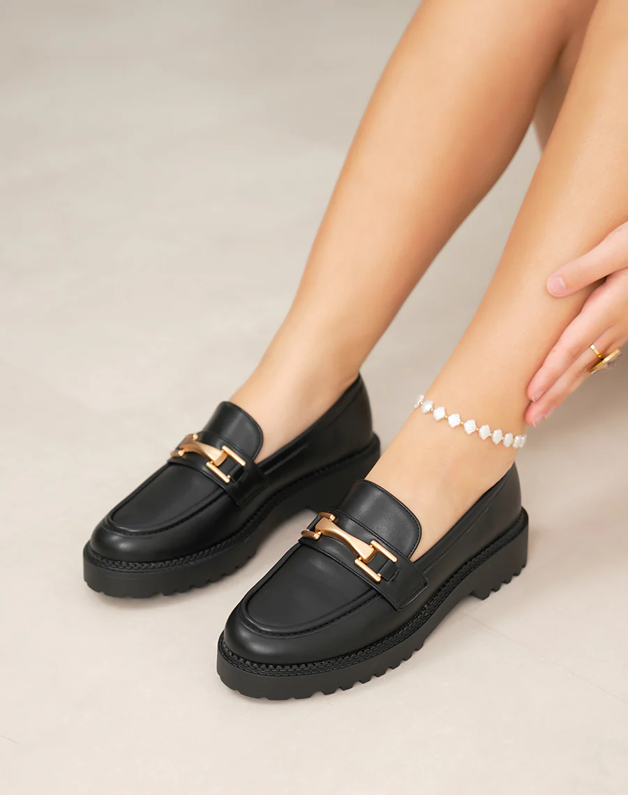 Mocassin femme noir chic avec bijou doré et semelle crantée confortable