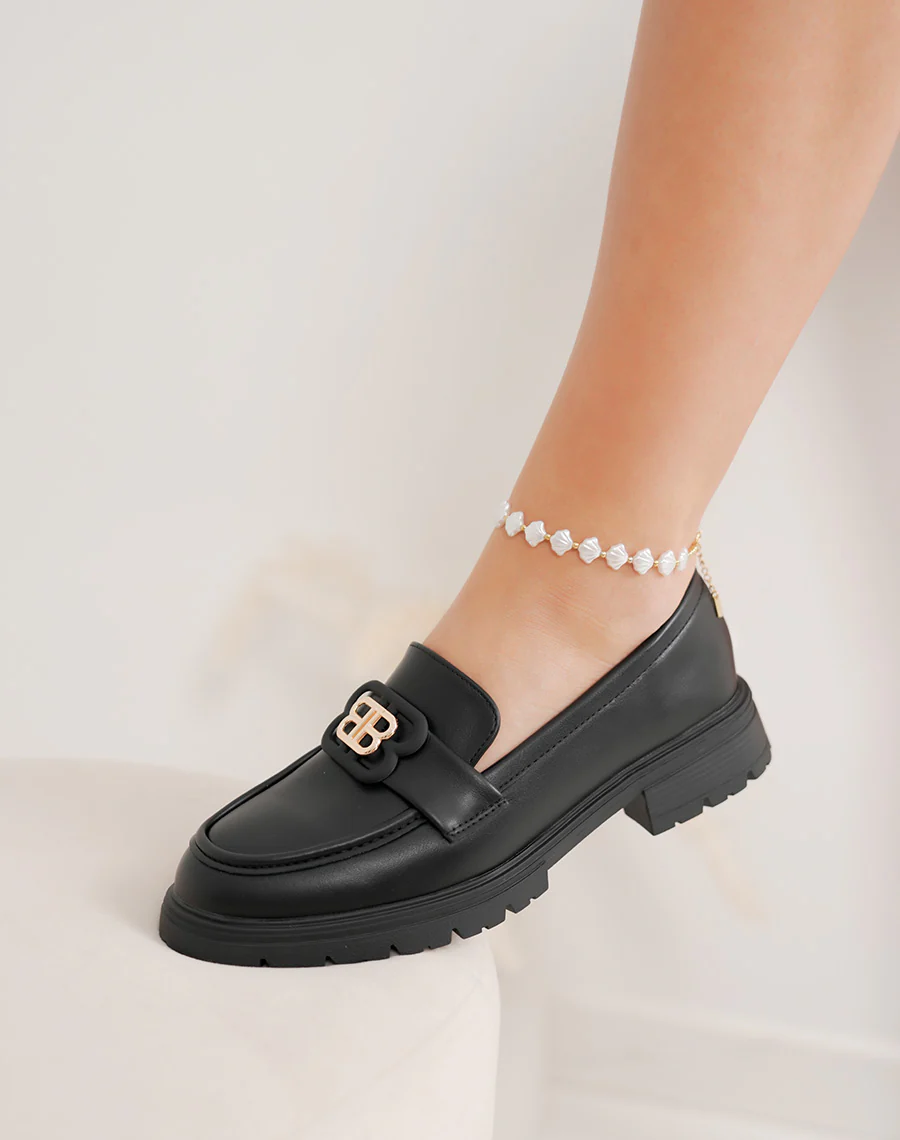 Élégance et modernité s’unissent dans ce mocassin femme noir en finition lisse, sublimé par un bijou doré à inscription BB sur le dessus. Ce modèle chic repose sur une plateforme crantée de 2 cm et une semelle de 4 cm, assurant un bon maintien et un confort optimal tout au long de la journée.