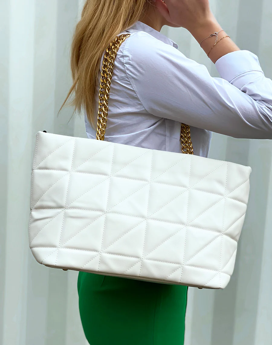Le beige pour une tenue classe on valide ! Une taille de sac à main femme parfaite pour y mettre nos affaires de tous les jours il est matelassé avec une chaine dorée qui le rend hyper tendance. Il a également une bandoulière en plus. L’intérieur est en 2 compartiments séparés par une grand pochette zipée.